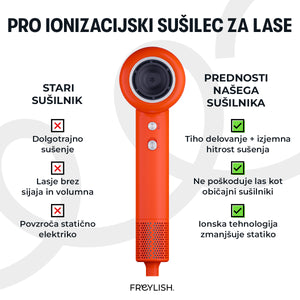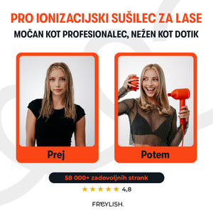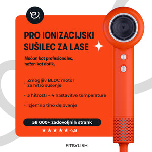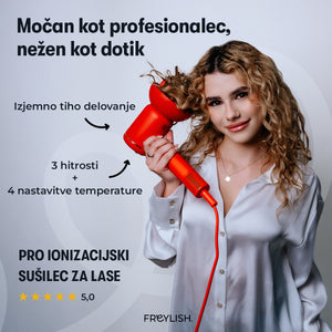Si želiš hitro in nežno sušenje las brez odvečnega hrupa? Freylish® PRO ionski sušilnik za lase združuje visoko hitrostni BLDC motor, napredno ionsko tehnologijo in ultra tihi način delovanja, da ti omogoči popolno oblikovanje frizure brez kompromisov. Njegov eleganten dizajn in pametne funkcije ga naredijo nepogrešljivega spremljevalca za vsakodnevno nego las.