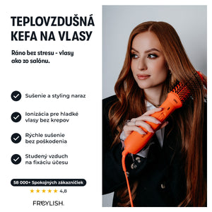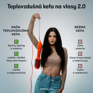 Snívaš o hladkých, lesklých a objemných vlasoch bez zdĺhavého fénovania a stylingu? Freylish® Teplovzdušná kefa 2.0 kombinuje sušič vlasov a stylingovú kefu v jednom zariadení, čím ti umožní dosiahnuť dokonalý účes za polovičný čas. Vďaka pokročilej turmalínovej a iónovej technológii bude tvoja koruna krásy chránená, hladká a bez krepovatenia.